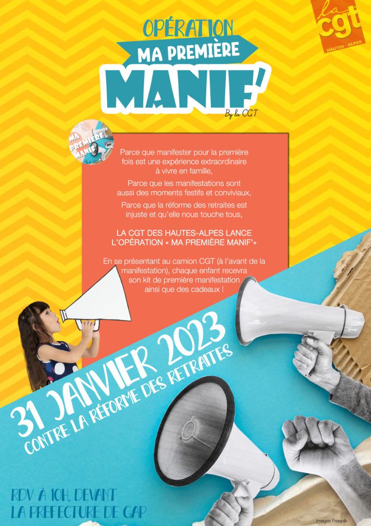 C’est le 31 janvier, nouvelle journée de mobilisation contre la réforme des retraites, que la CGT des Hautes-Alpes a choisi pour lancer son opération « Ma première manif’ ». Ce jour là, comme dans toutes les manifestations qui suivront, les enfants sont invités à se présenter au camion de l’organisation, à l’avant du défilé, pour récupérer leur « Kit de première manifestation ».