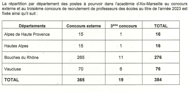 Le rectorat d’Aix-Marseille vient de diffuser le nombre de postes des Professeur.es des Écoles recruté.es par concours avec la répartition de ces postes pour l’année scolaire 2023-2024 :